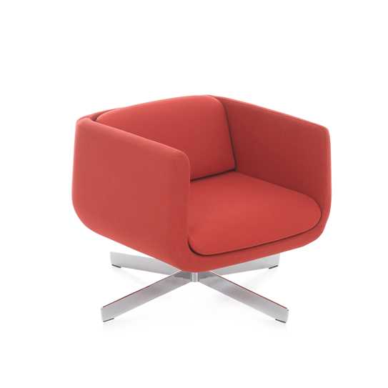 A family of products including a lounge chair and a sofa. Oddset armchair and sofa are offered on a simple four-tube leg frame and the armchair is also offered on a detailed laser cut four-star rotating base. The soft seat and back cushions complete the product’s comfort and offer a relaxed feeling.