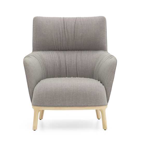 Bambi is a lounge chair designed for relaxation, featuring soft, curvaceous lines and generous proportions. Upholstered in luxurious fabric or leather, it offers enveloping comfort in a range of colors. The wide, gently curved seat and versatile backrest, available in both high and low options, ensure exceptional support. Artisanal details, such as thin visible stitching and the natural wood base, add a refined touch.